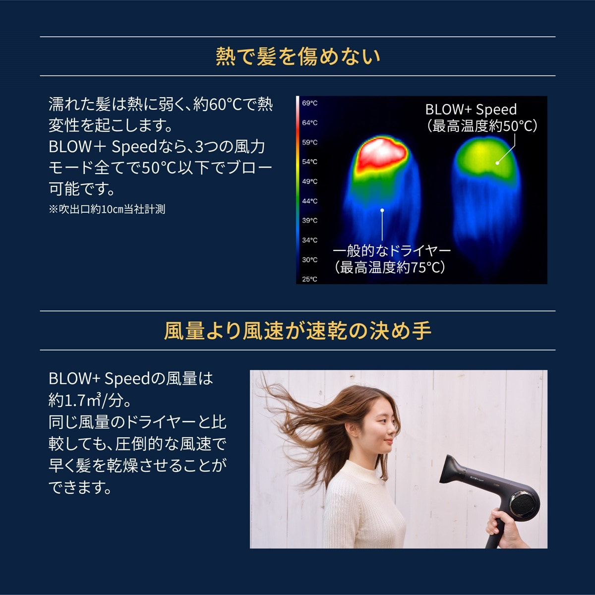 BLOW+Speedなら、3つの風力モード全てで50℃以下でブロー可能です。
